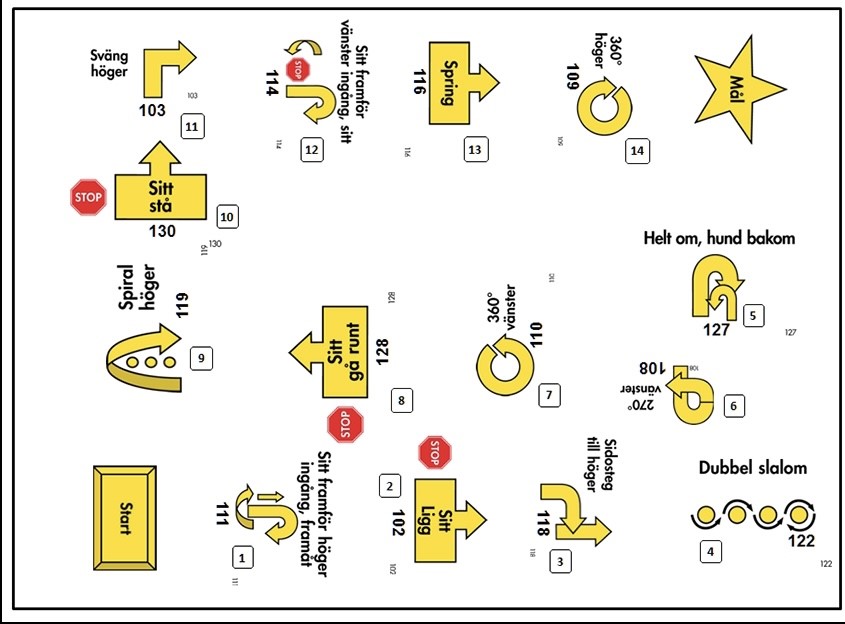 Föraren behöver lära sig de olika skyltarna för att kunna träna momenten med sin hund. Man fortsätter sedan med korta enkla banor och försvårar efterhand. Och all träning ska upplevas som rolig för både hund och förare.
